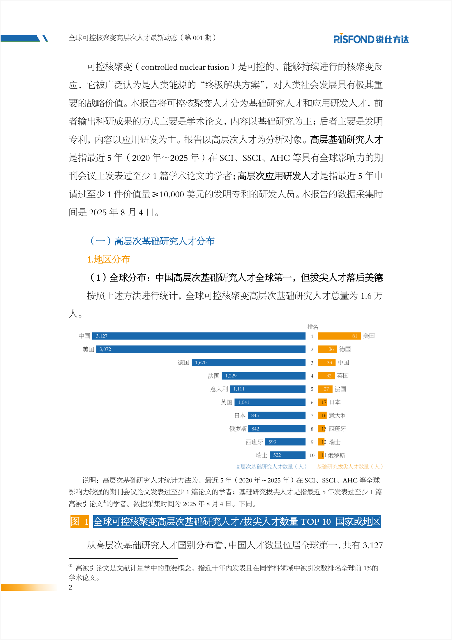 高层基础研究人才 是指最近 5 年(2020 年~2025 年)在 SCI、SSCI、AHC 等具有全球影响力的期 刊会议上发表过至少 1 篇学术论文的学者;高层次应用研发人才是指最近 5 年申 请过至少 1 件价值量≥10,000 美元的发明专利的研发人员。本报告的数据采集时 间是 2025 年 8 月 4 日。