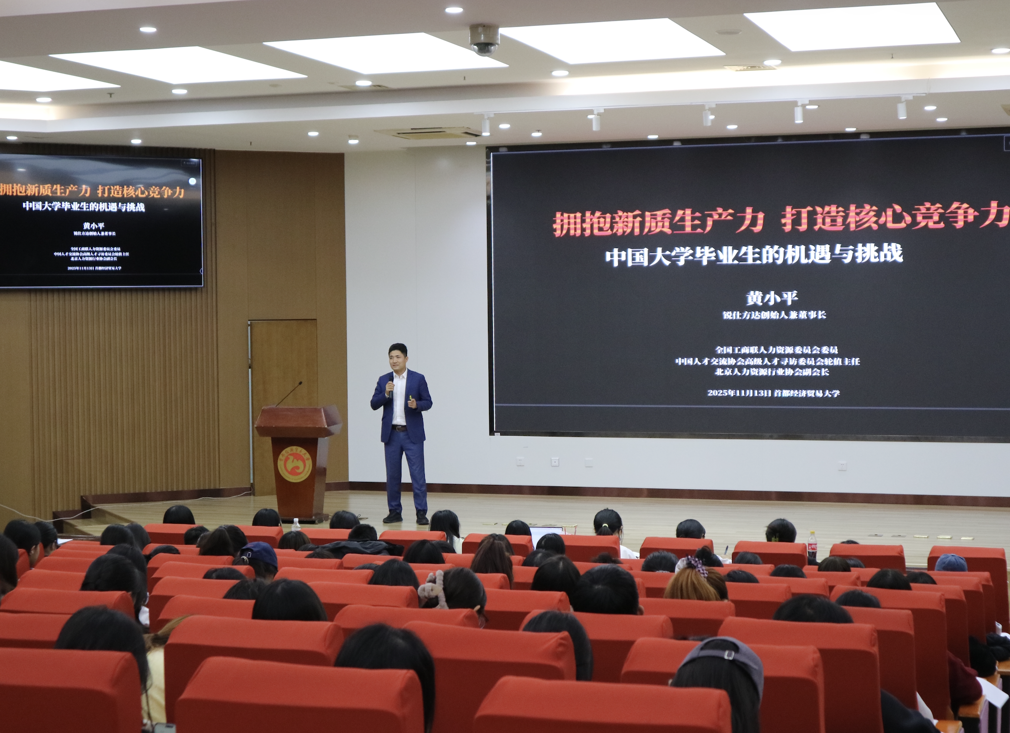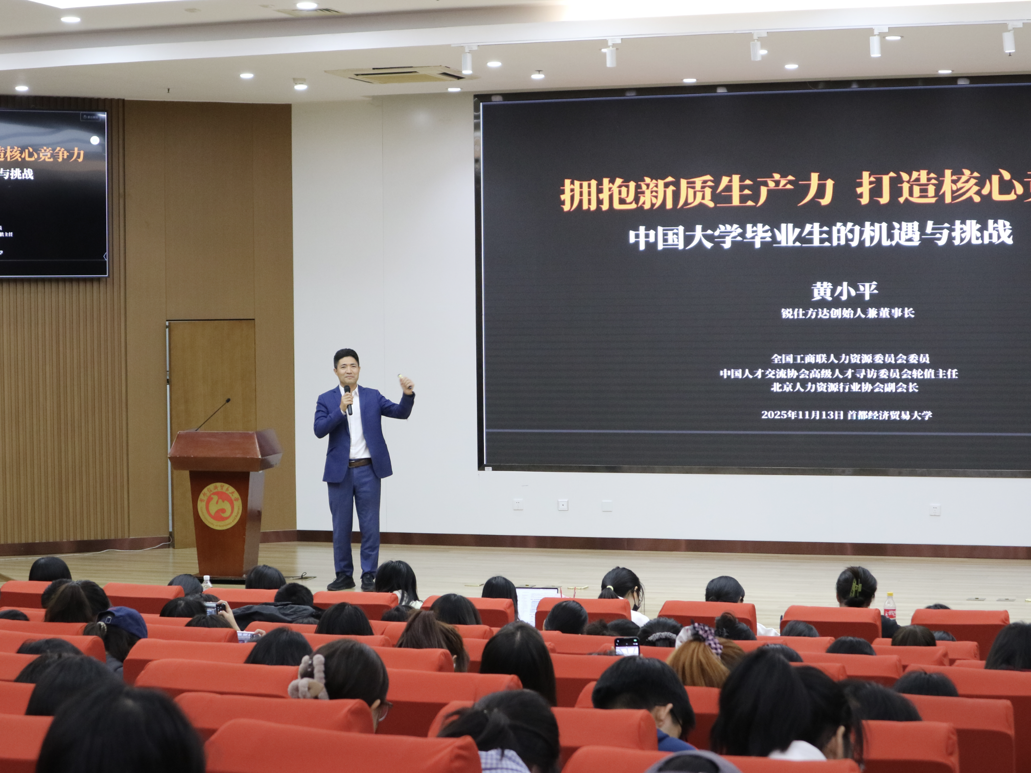 11月13日,首都经贸大学200余名本科生齐聚一堂,共赴一场职场启蒙之旅。本次分享嘉宾为锐仕方达创始人黄小平先生,他以资深行业视角拆解职业生涯规划的核心逻辑,用实战经验点拨高效求职的关键技巧,为怀揣职业憧憬的学子们搭建起从校园到职场的沟通桥梁,助力青年学子在职业赛道上精准定位、稳步前行。