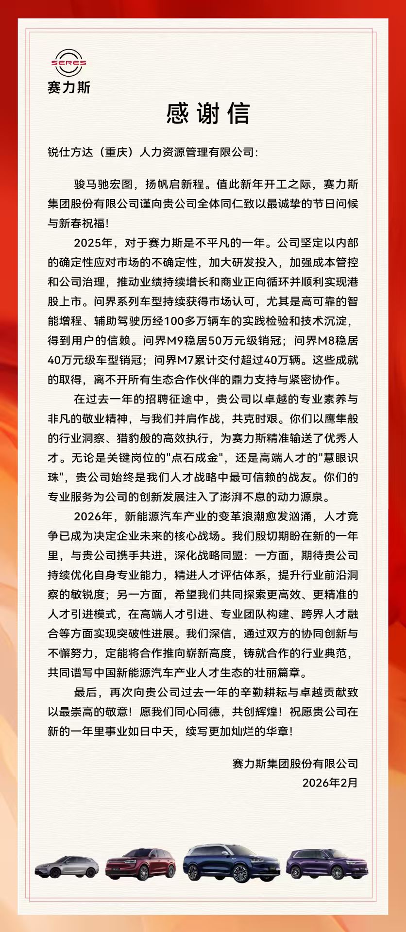 2026年02月24日,锐仕方达收到来自著名汽车制造企业重庆赛力斯汽车的新春感谢信,作为赛力斯汽车的长期人才战略供应商,锐仕方达重庆公司和多家兄弟公司为赛力斯汽车提供各类高端稀缺人才招聘服务,在重庆公司谭川的带领下,锐仕方达组织全国交付网络为赛力斯汽车的战略升级和增长提供源源不断的人才动力。