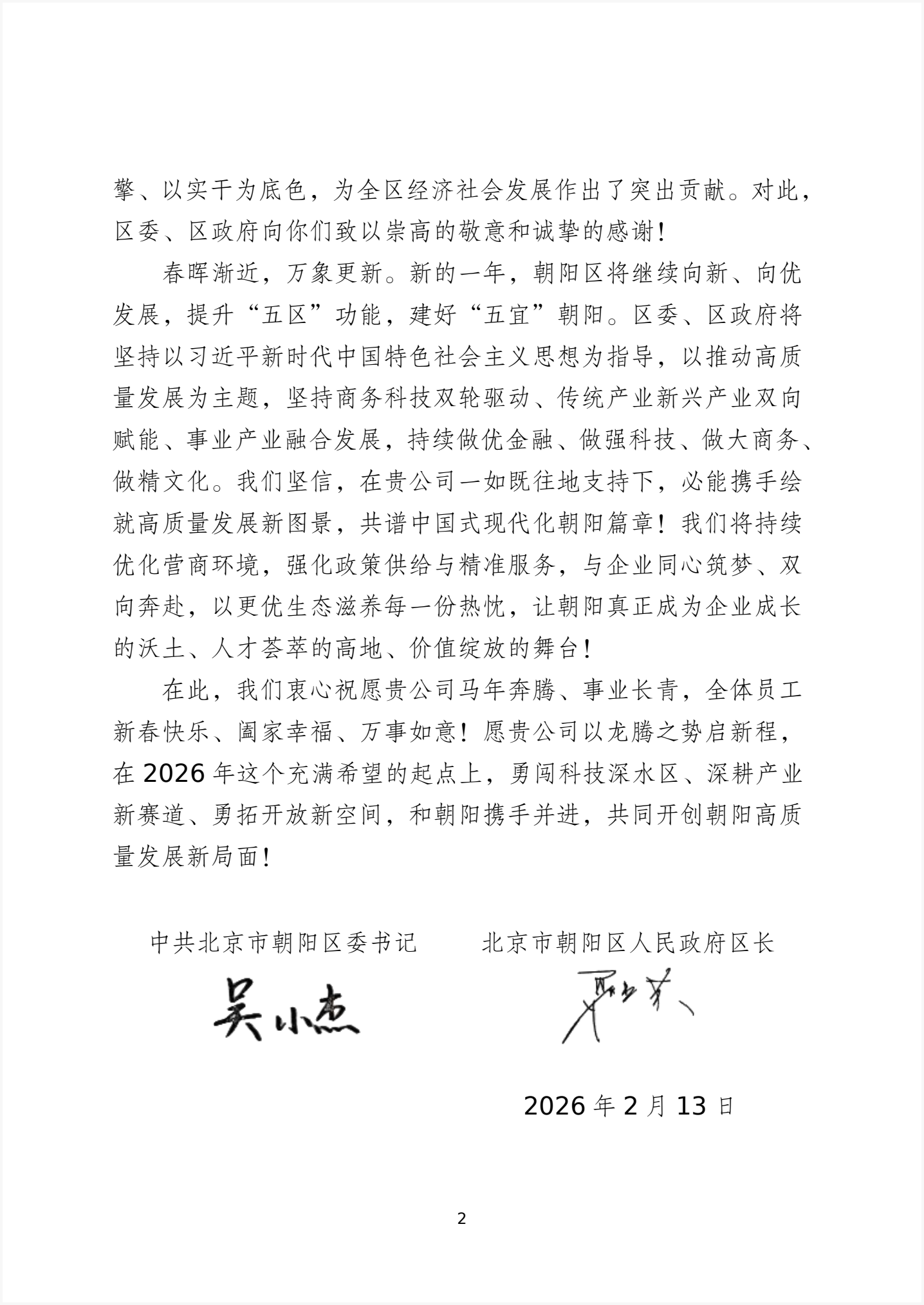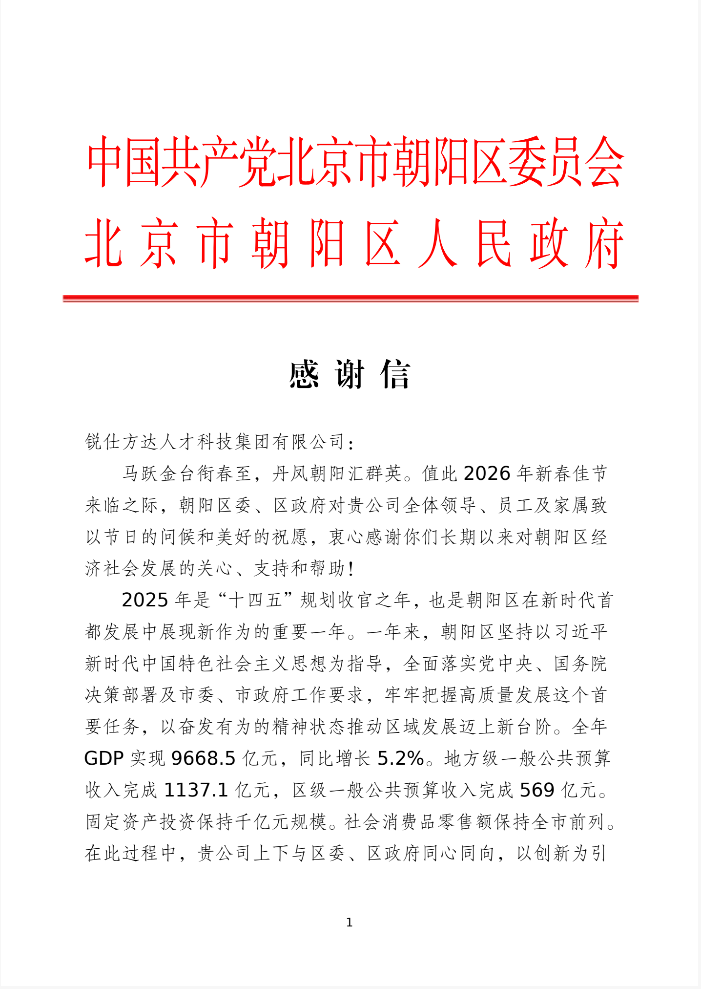 2026年02月13日,锐仕方达集团总部收到来自北京市朝阳区区委、区人民政府的来信!作为全国猎头行业头部公司,锐仕方达十年如一日扎根朝阳,一心谋发展,致力于为高成长型高科技型企业提供各类别高端稀缺人才招聘服务,为推动科技创新和经济增长发挥重要作用。